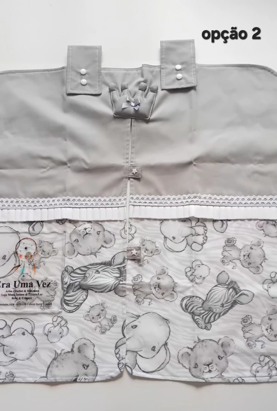 Organizador tecido cinzento e branco com padrão de bichos e detalhes rendados