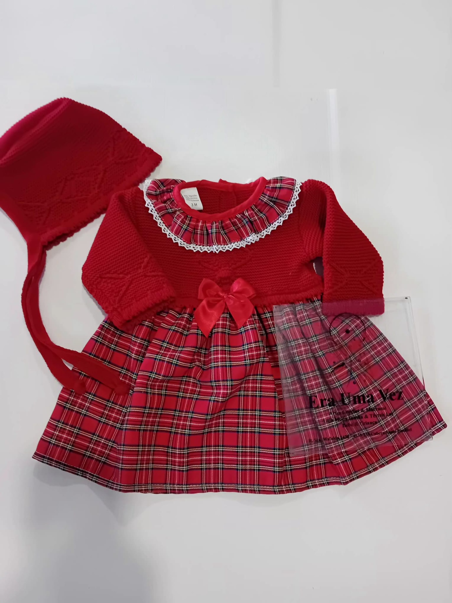 Conjunto de bebé vermelho com vestido de malha e folho xadrez e gorro tricotado